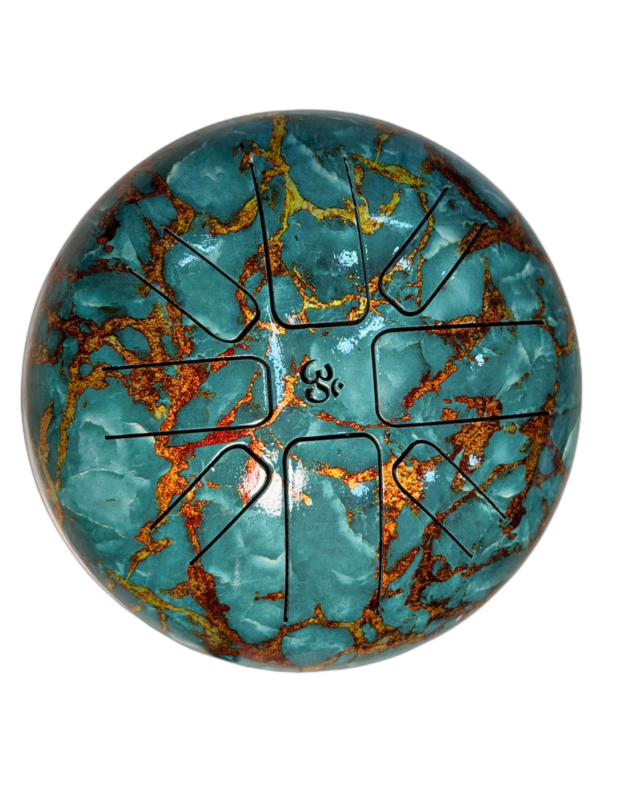 The stunning emerald green marble body with gold–copper artistic patterns makes this drum not only a musical instrument but also a premium handcrafted décor piece for your home, studio, or meditation space.